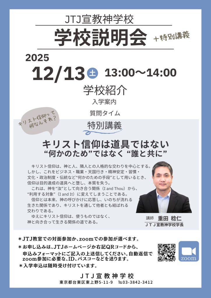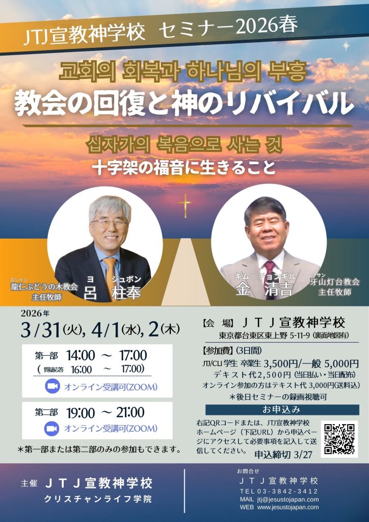 JTJ宣教神学校は、2022年4月に設立した一般社団法人の傘下のもと、新たに開校する JTJ宣教神学校の姉妹校、クリスチャンライフ学院と共に 「神学なき宣教は迷走、宣教なき 神学は空虚」という創立者、岸義紘先生のビジョンを継承して、これからも日本の福音宣教 のためにJTJを愛する皆さんと一緒に尽力していきます。これからも私たちJTJ宣教神学校 の働きを覚えてお祈りいただけたら幸いです。どうぞよろしくお願いします。
