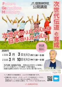 公開講座「次世代伝道」 2026 2/20 お知らせ 2026年2月20日 2026年2月20日 目次「次世代伝道」 講師:西村 希望日時:3月3日(火)、3月10日(火)19:00~21:00場所:JTJ教室 or Zoom受講料:無料 お申し込みフォーム このフォームに入力するには、ブラウザーで JavaScript を有効にしてください。お名前 *メールアドレス *メールアドレスメールアドレスを確認電話番号 *参加方法 *教室Zoom送信 お知らせ この記事が気に入ったら いいねしてね! よかったらシェアしてね! URLをコピーしました!